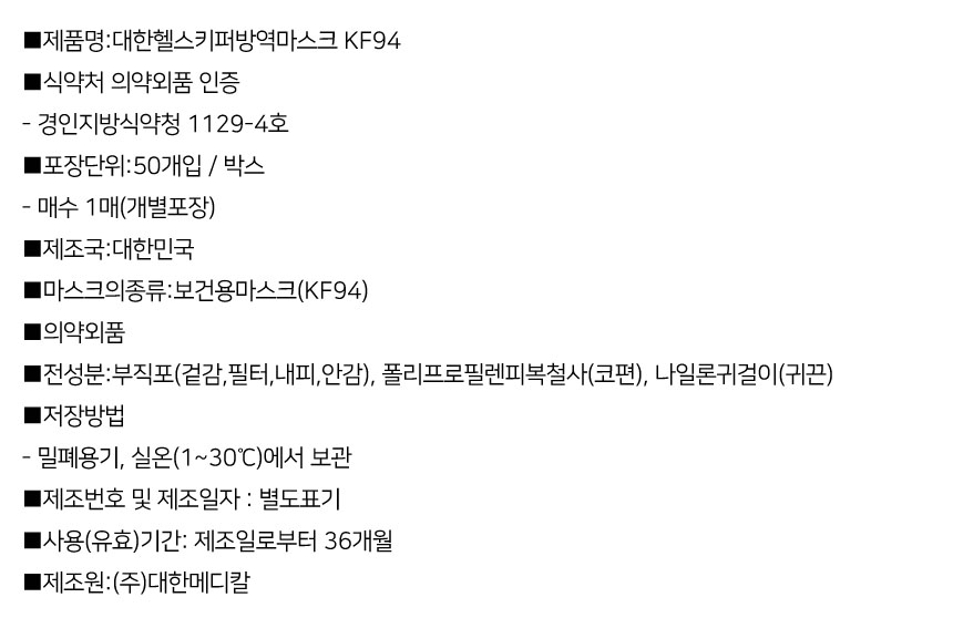 > 대한위재 대한헬스키퍼 마스크 KF94 50매 대형 식약처허가