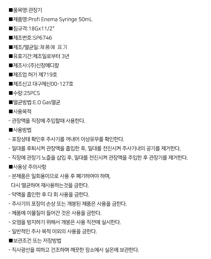 > 신창메디칼 일회용 관장기 Enema Syringe 50ml 18G